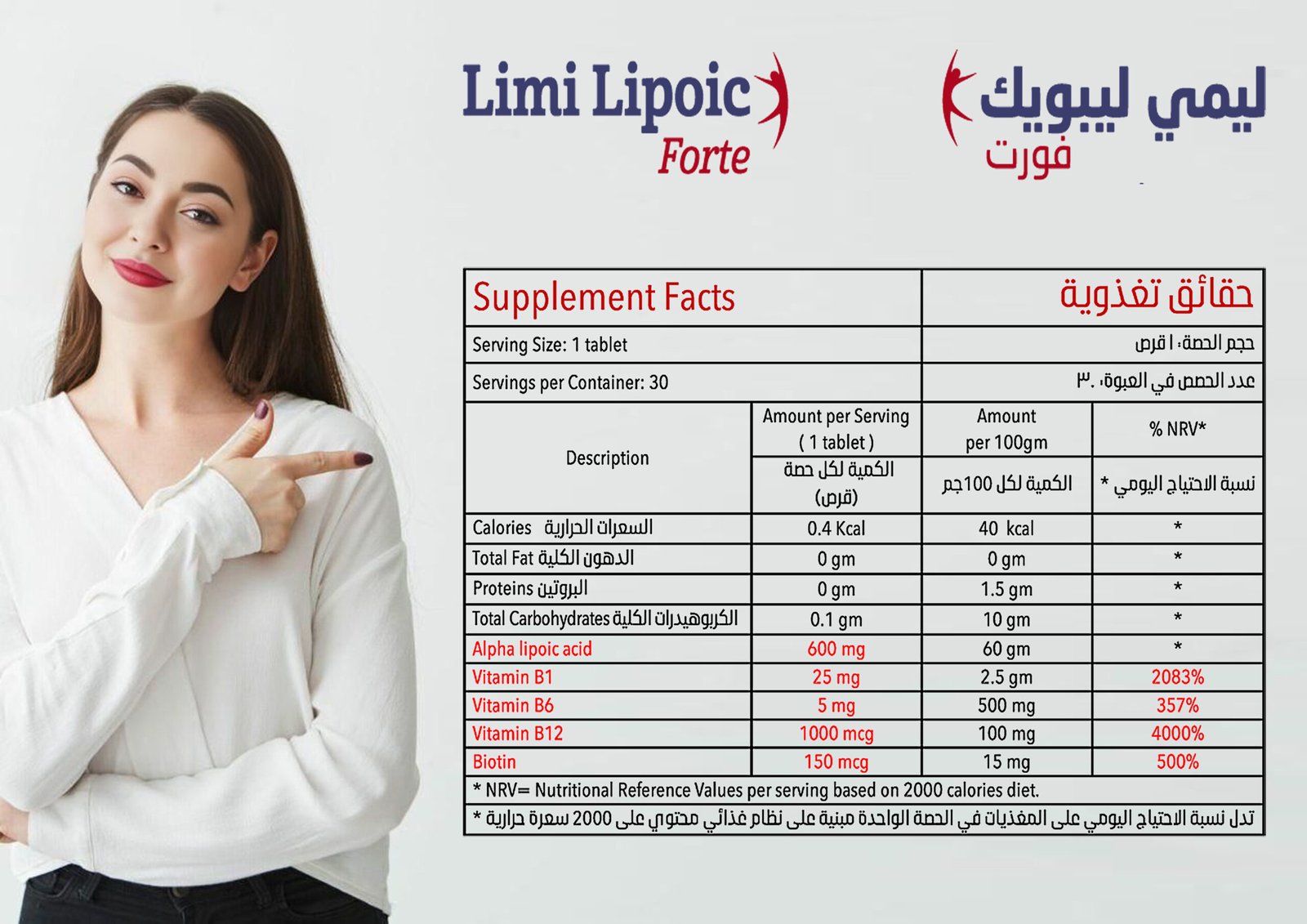 • البيوتين – 150 ميكروجرام: يحسن التمثيل الغذائي للدهون والكربوهيدرات، يعزز صحة الجلد والشعر والأظافر، ويدعم الطاقة.